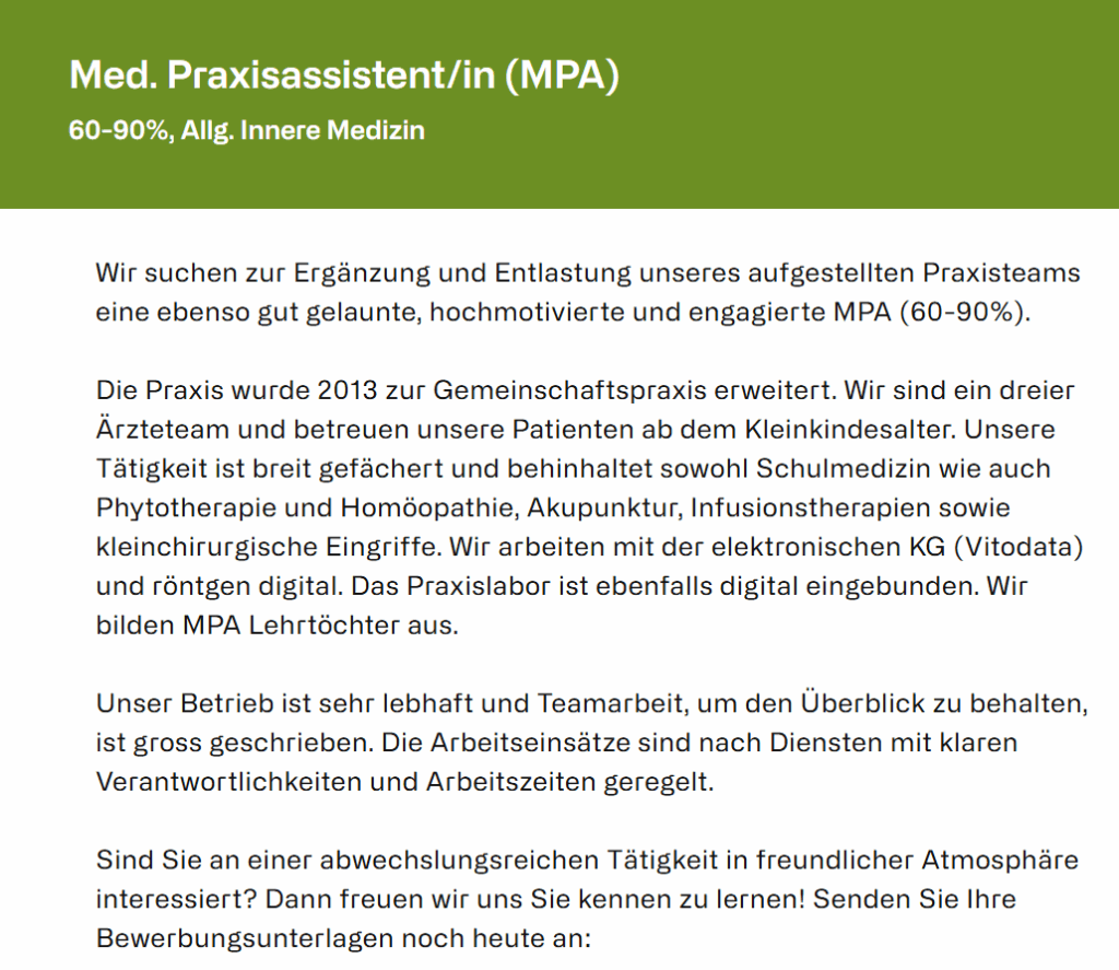 Link auf praxisstellen.ch: Med. Praxisassistent/in (MPA) Allg. Innere Medizin (60-90%) Zuchwil
